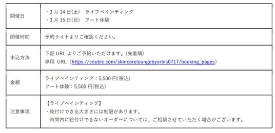 3 月 14 日(土)と 3 月 15 日(日)の 2 日間に田中マリナさんによるワークショップを SKINCARE LOUNGE BY ORBIS にて実施いたします。3/14(土)には、田中マリナさんがその場で世界に一つだけの絵を巾着に描くライブペインティングを実施。花や動物などのイラストをリクエストいただき、オリジナルの巾着を作り上げます。3/15(日)には、田中マリナさんアドバイスのもと、桜をテーマにキャンバスにお客様自身で自由に絵画を描いていただくアート体験を実施。絵を通じて自分の心と対話する時間を過ごすワークショップとなっております。