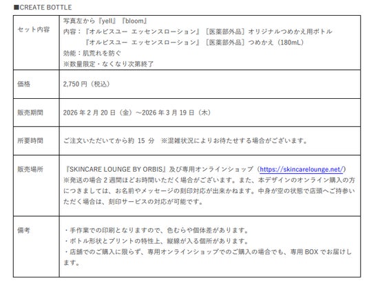 オルビス株式会社(本社:東京都品川区、代表取締役社長:山口 裕絵)のブランド初となる体験特化型施設 『SKINCARE LOUNGE BY ORBIS』は、2026 年 2 月 20 日(金)から 2026 年 4 月 19 日(日)の期間、桜をテーマに 2 名のアーティストとコラボレーションを行うイベント「SAKURA ART EVENT」を開催いたします。2026 年 2 月 20 日(金)から 2026 年 3 月 19 日(木)の第一弾では、北海道出身のアーティスト田中マリナさんとのコラボレーションを行います。また、2026 年 3 月 20 日(金)から 2026 年 4 月 19 日(日)の第二弾では、4 人組バンド CHAI の元メンバーで作家・アーティストとして活動している YUUKI さんとコラボレーションいたします。第一弾では『オルビス ユー エッセンスローション』のオリジナルつめかえ用ボトルが作れる『CREATE BOTTLE』のサービスに、コラボデザインのオリジナルデザインボトル 2 種が登場。『JUICE BAR』では桜をイメージしたドリンクを期間限定で販売します。また、3/14(土)と 3/15(日)には、田中マリナさんによるワークショップを開催。田中マリナさんが世界に一つだけの絵を巾着にその場で絵付けをするライブペインティングと、田中マリナさんアドバイスのもとキャンバスに絵を描く体験をするアート体験のワークショップを実施いたします。