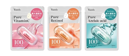 Yunth史上最大量の高濃度美容成分を配合したシートマスク。ビタミン(※2)、レチノール(※3)、アゼライン酸(※3)の3種類。