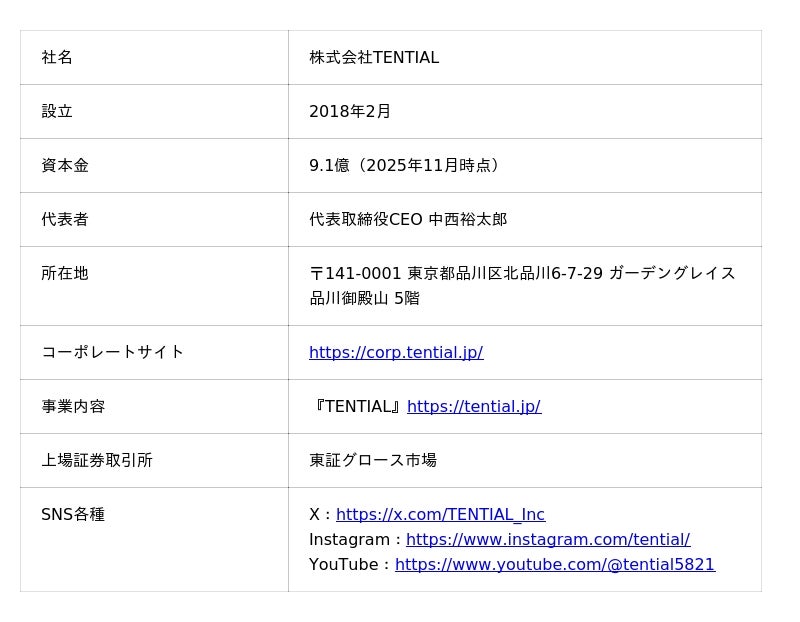 コンディショニングブランド『TENTIAL』は、アスリートの知見と最新技術・研究に基づき、機能性を追求した製品・サービスを提供。24時間365日、日常生活のあらゆるシーンで心身を整え、疲労回復やパフォーマンス向上をサポートするコンディショニング活動を推進しています 。すべては個人のコンディションとポテンシャルを引き出すという信念のもと、株式会社TENTIALは、健康に前向きな社会の実現のため、コンディショニングの社会実装に取り組んでまいります。