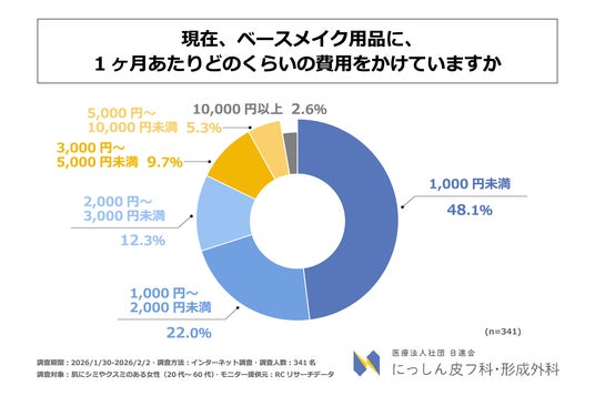 肌にシミやクスミのある女性の約7割が、現在ベースメイク用品にかける1ヶ月あたりの費用は2,000円未満と回答