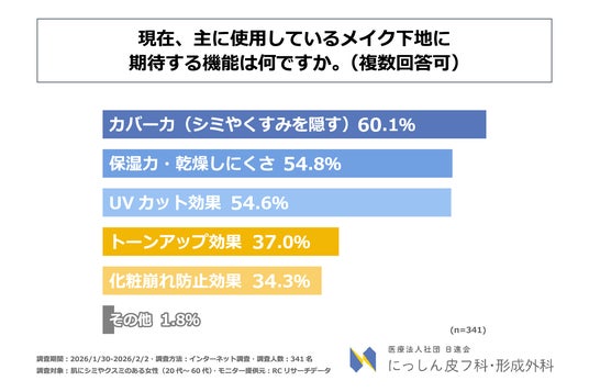 続いて、「現在、主に使用しているメイク下地に期待する機能は何か」を尋ねる設問への回答では、1位が「カバー力(シミやクスミを隠す)」で60.1%、2位が「保湿力・乾燥しにくさ」で54.8%、3位が「UVカット効果」で54.6%という結果になりました。この結果から、肌にシミやクスミのある女性が主に使用しているメイク下地に最も期待する機能は「カバー力」であることが明らかになりました。