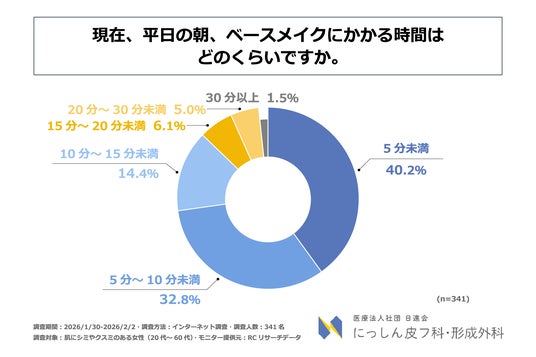 肌にシミやクスミのある女性の7割以上が、平日の朝、ベースメイクにかかる時間は10分未満