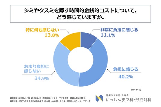 光の反射でシミやクスミを自然に隠すUVベースの新製品の登場など、カバー力の高いメイク下地の進化は、肌のコンディションがもたらす女性たちの悩みを軽減する可能性を秘めています。しかし、これらの製品は、女性の肌のシミやクスミといった悩みを根本的に解決するわけではありません。また、シミやクスミを隠すことにかかる「コスト」(時間、費用、精神的負担など)を女性たちがどのように考えているかはまだ十分に明らかになっていません。そこで、医療法人社団日進会 にっしん皮フ科・形成外科は、肌にシミやクスミのある女性を対象に「シミやクスミを隠すコストに関する意識調査」を実施しました。
