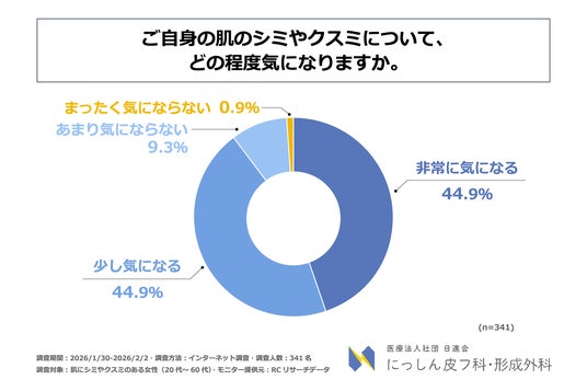 まず、「自身の肌のシミやクスミについてどの程度気になるか」を尋ねる設問への回答では、1位が同率で「非常に気になる」「少し気になる」で44.9%、3位が「あまり気にならない」で9.3%という結果になりました。同率1位の回答比率を合計すると89.8%となり、この結果から、肌にシミやクスミのある女性の約9割が、自身のシミやクスミを、程度の差こそあれ、気にしていることが判明しました。
