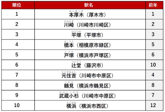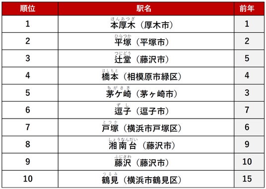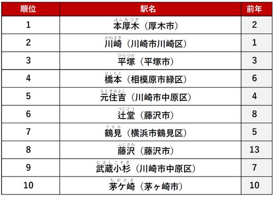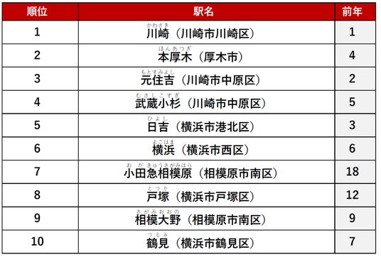 2位に「川崎」駅、3位「平塚」駅がランクインしました。