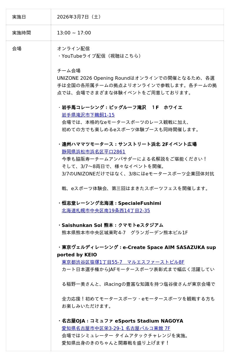国内で唯一JAF(日本自動車連盟)の公認を受けたeモータースポーツ大会(レーシングゲームを使用したeスポーツ大会)「UNIZONE(ユニゾーン)」を運営する一般社団法人日本eモータースポーツ機構(東京都千代田区、代表理事:出井宏明、以下「JeMO」)は、2026年3月7日(土)に行われるe-Motorsport League UNIZONE 2026 Opening Roundの出場選手および実施レース内容等詳細情報をお知らせします。UNIZONE 2025に引き続き、今年も「HOME&HOME」形式で開催し、選手は全国の各チーム拠点よりオンラインで参戦します。