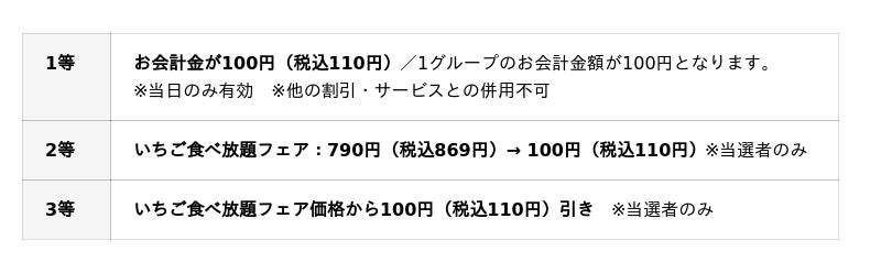 1等はそのグループのお会計金額がなんと100円(税込110円)に!ぜひこの機会にご参加ください。