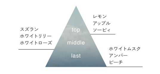 さわやかなフルーティさと、石けんを思わせる清潔感。 広がるのは、どこまでも澄んだ透明な世界。 晴れやかなフローラルに包まれた後は、ホワイトムスクやアンバーの温かな香りがそっと抱きしめる。