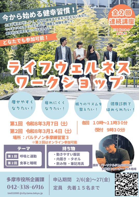 株式会社ワールドフィット(本社:東京都渋谷区/代表取締役:高城大樹)が運営する、全国170店舗以上を展開するパーソナルジム【BEYOND】のBEYOND多摩センター店と聖蹟桜ヶ丘店は、多摩市役所と連携し、地域住民向けワークショップ「ライフウェルネスワークショップ」を開催いたします。