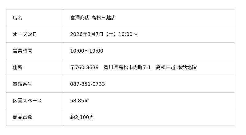 日本最大級の製菓・製パン材料、器具専門店として創業106年の株式会社富澤商店は、2026年3月7日(土)に「富澤商店 高松三越店」を高松三越 本館地階にリフレッシュオープンいたします。