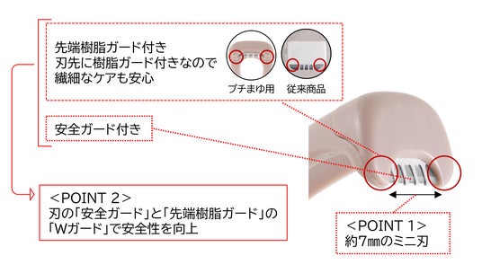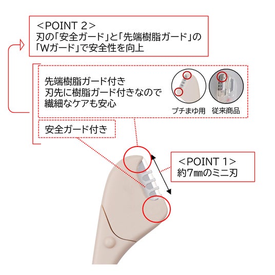 細かいケアのしやすさにこだわった「プチまゆ用カミソリ」は、約7mmの超ミニ刃とそる部位を見やすい形状のカミソリ。刃は先端樹脂ガードと安全ガードのWガード仕様とすることで安全性を向上させているため、まゆの仕上げなど繊細な細部のケアも安心です。