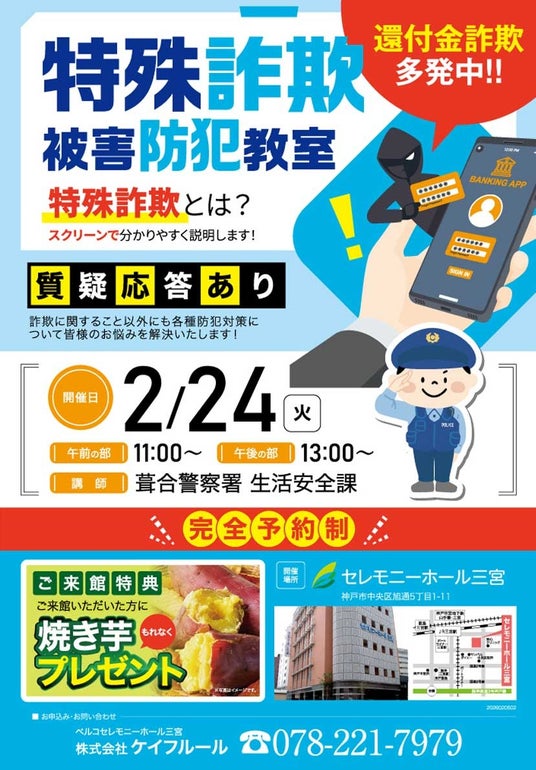 株式会社ベルコ(本社大阪府池田市)は近年増加する還付金詐欺や金融機関を装った不正アクセス被害などの特殊詐欺から地域住民を守るため、「特殊詐欺被害防犯教室」を2026年2月24日(火)にセレモニーホール三宮にて開催いたします。