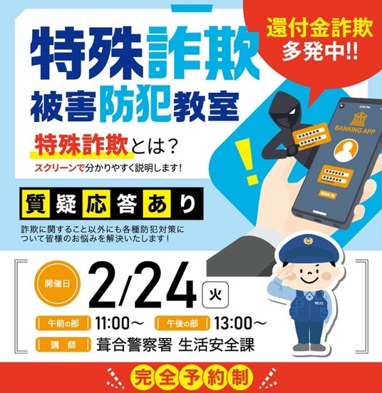 本教室では、最新の詐欺手口を知り、被害を未然に防ぐための具体的な対策を学ぶことで、地域の安心・安全な暮らしづくりに貢献することを目的としています。
