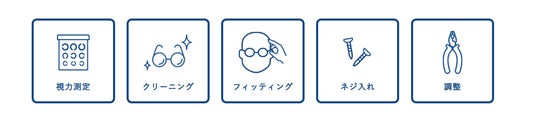 ご愛用のメガネのメンテナンスもAIGANにお任せください。視力測定・クリーニング・フィッティング・ネジ入れ・調整の「5つの無料サービス」を行っております。