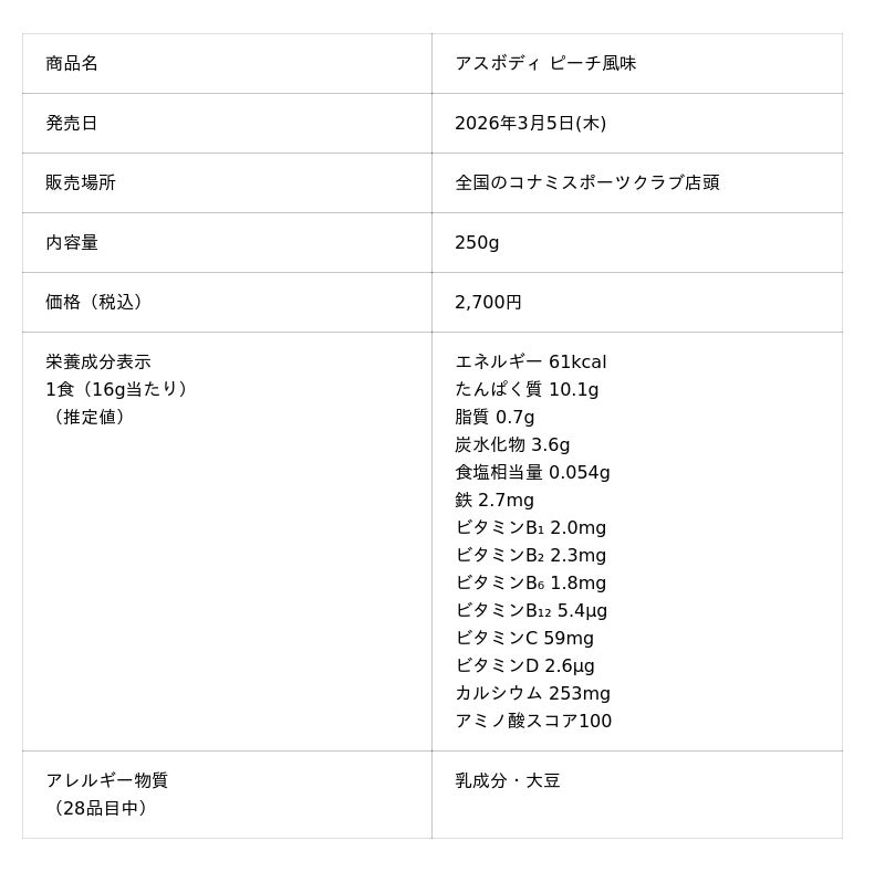 コナミスポーツ株式会社(以下、「弊社」)は、カルシウムとビタミンDを配合した「アスボディ ピーチ風味」を、3月5日(木)から全国のコナミスポーツクラブ店頭で数量限定販売します。