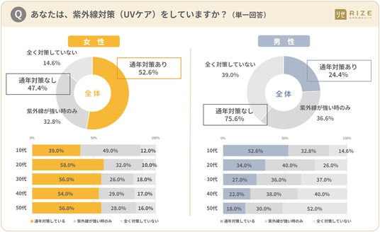 女性の半数(47.4%)、男性の8割(75.6%)が「日ごろUV対策をしていない」と回答。「通年UV対策している」は女性5割(52.6%)・男性2割(24.2%)に。