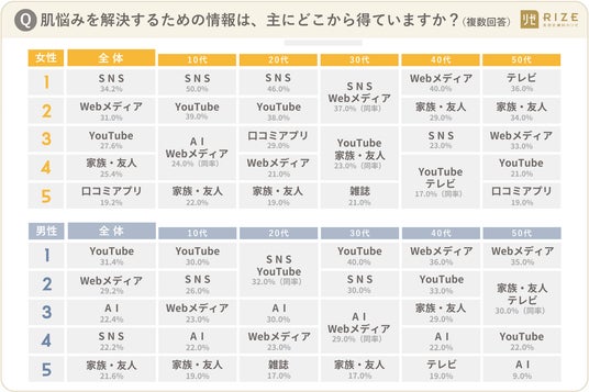 ■2.【肌悩み解決の情報源】女性は「SNS(34.2%)」、男性は「YouTube(31.4%)」が最多回答