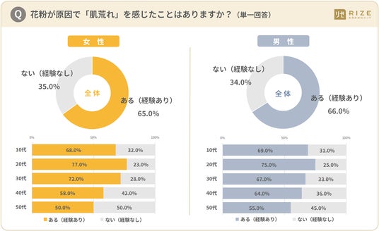 「花粉による肌荒れ」は、男女ともに7割が「経験あり」(女性:65.0%/男性:66.0%)と回答。特に20代男女の8割が経験しており、年代別で最多回答に(女性:77.0%/男性:75.0%)。