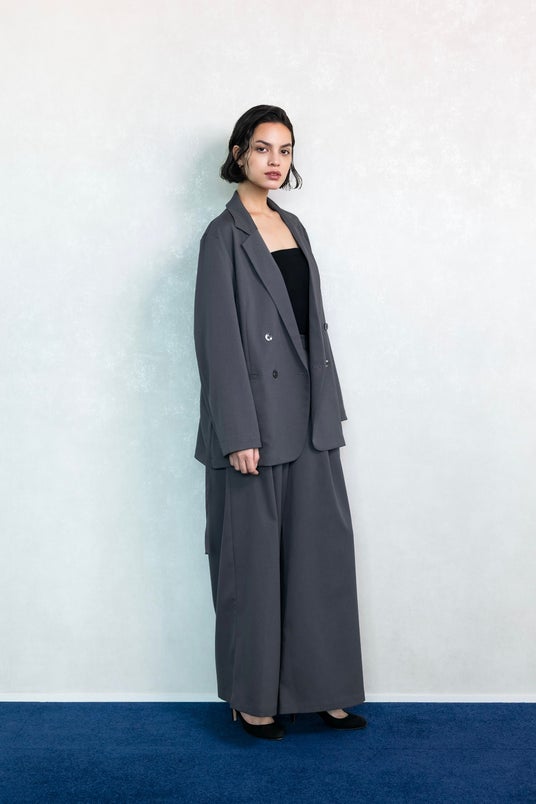 リラックスダブルジャケット作業の邪魔をしないゆとりのあるボクシーなシルエット。取り外し可能な紐でウエストを絞りイメージを変えられる。裏地無し/左胸ポケット/大きめ腰ポケット/ゆとりのあるアーム/後センターベント
