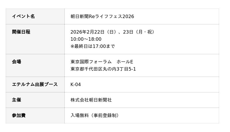 『永遠の美しさへの夢が、夢に終わらない未来を創りあげること』を使命に掲げる、化粧品の研究開発・製造販売を行う株式会社エテルナム(本社:東京都渋谷区、代表取締役:松本隆明)は、2026年2月22日(日)~23日(月・祝)に東京国際フォーラム(東京都千代田区)にて開催される「朝日新聞Reライフフェス2026」に出展します。