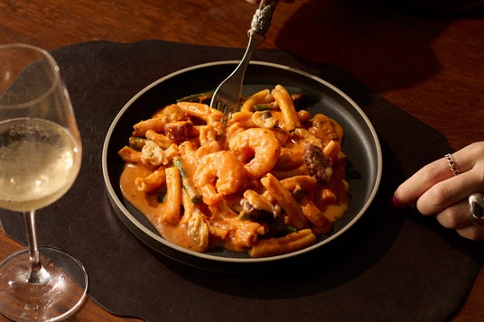 ショートパスタ“カサレッチェ”を使い、魚介と濃厚トマトソースを合わせました。