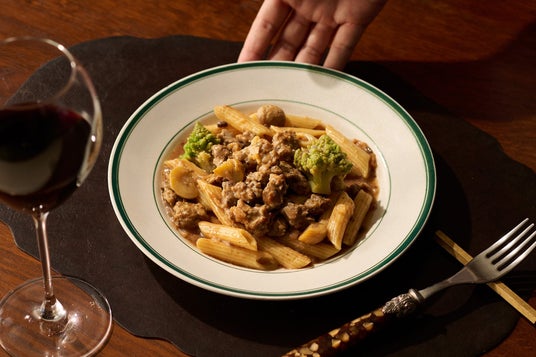 ショートパスタ、“ペンネ・リガーテ”を使い、こんがり焼いた粗挽肉を主役に。