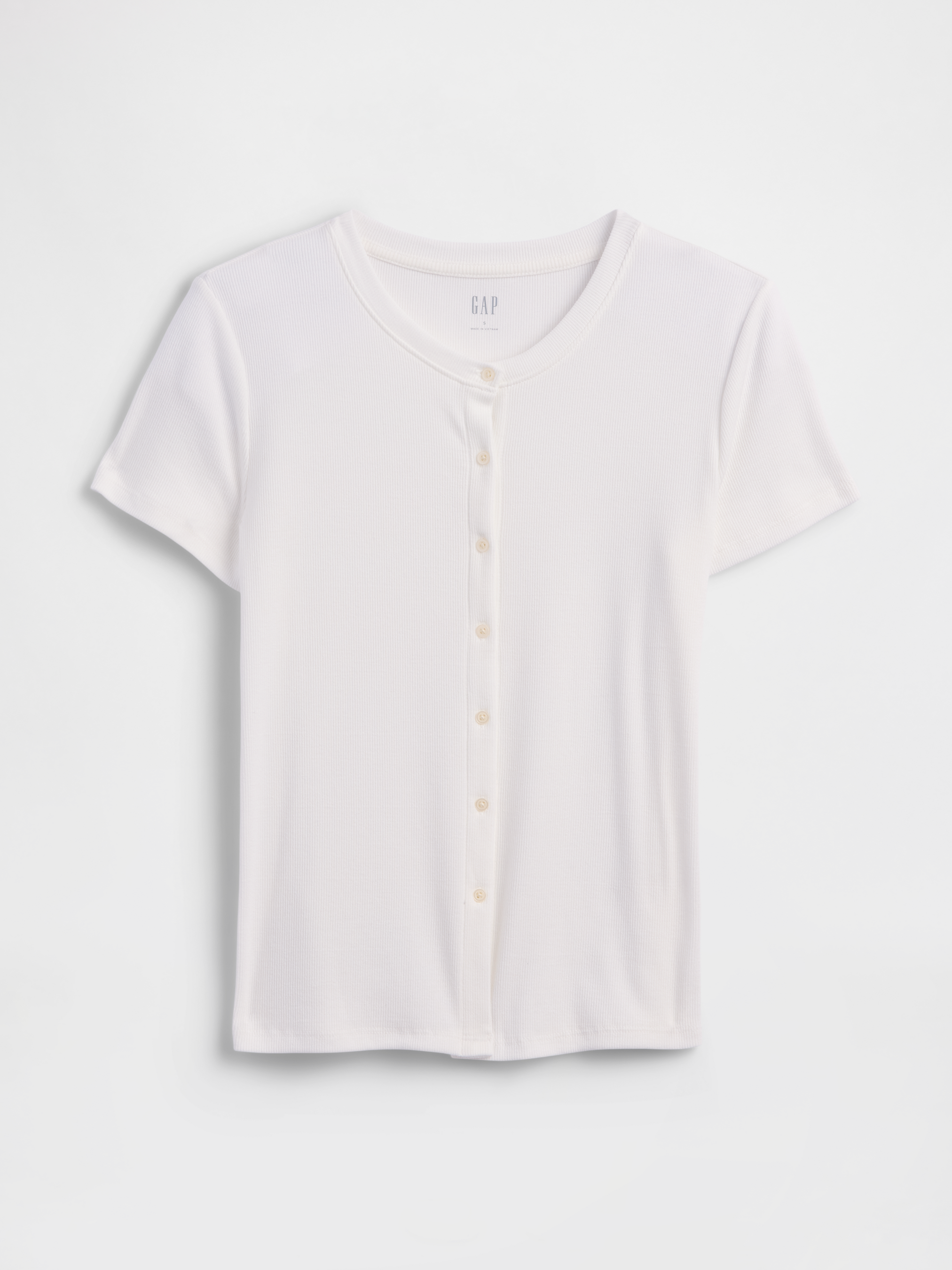 ・ Women’s / リブ ボタンアップトップス(3,990円):ボタンを開けてレイヤードスタイルも楽しめるTシャツ。