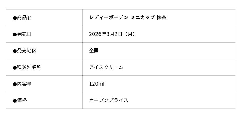 株式会社ロッテ(東京都新宿区、代表取締役社長執行役員:中島英樹)は3月2日(月)に「レディーボーデン」ブランドからミニカップの新商品となります「レディーボーデン ミニカップ 抹茶」を発売します。