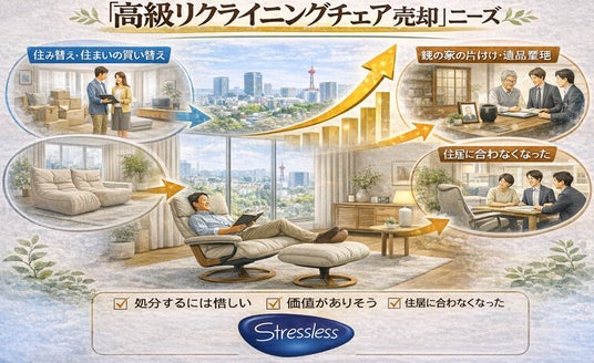 エコーネスのストレスレスシリーズは、新品価格20万円~40万円台が中心となる高級パーソナルチェアです。千葉内では、定年後の住み替え、マンションへのダウンサイジング、ご両親のリビング整理、在宅時間増加に伴う買い替え、遺品整理で高級チェアが出てきたといった背景で、売却相談が増えています。