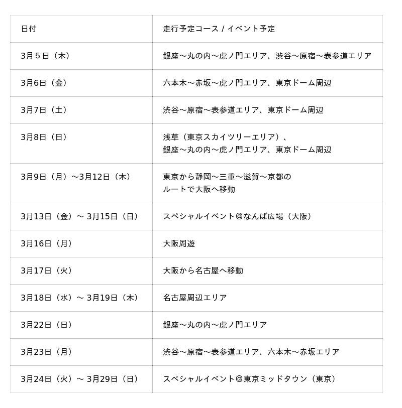 ※走行ルートや予定は予告無く変更することがあります。