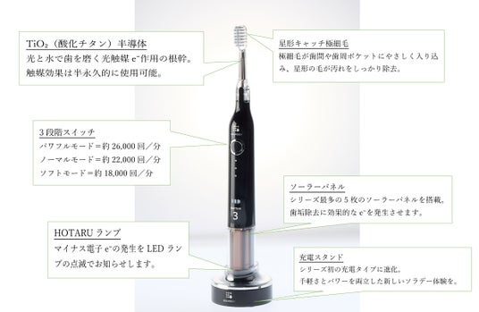 主な機能: TiO2半導体、5枚のソーラーパネル、HOTARUランプ(電子発生のお知らせ)、3段階音波振動、充電式
