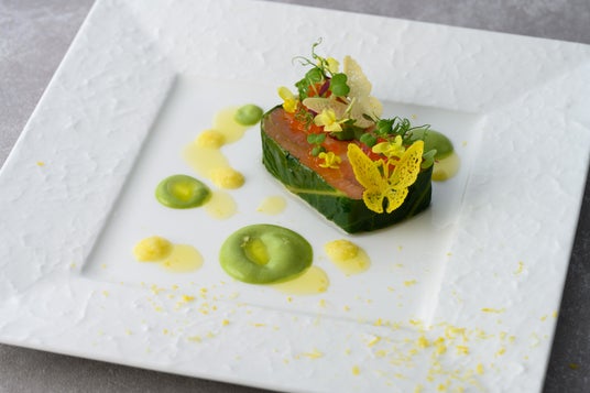 熟成の時を経て角が取れ、穏やかな円熟味を帯びた発酵レモンと香草の躍動が重なり、草萌え始めた野山の情景を映し出します。蝶のチュイルが舞い降りる「新緑」の舞台を、ひと皿のプレッセに美しく封じ込めました。