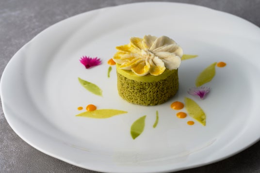 春の庭園をひと皿に凝縮した、パティシエ特製のデザート。鮮やかな新緑のピスタチオムースに、大輪の花が咲き誇るような美しい仕立て。芽吹きの季節を祝う軽やかな口溶けとともに、春の香りが優しく鼻先をくすぐります。五感で愉しむ「華やか」な終幕が、心解ける甘いひとときを届けます。
