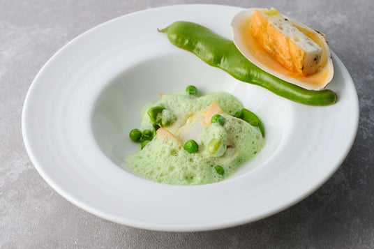 鮮やかな緑のソースは、春豆の息吹と貝の旨みが溶け合う新緑の海。