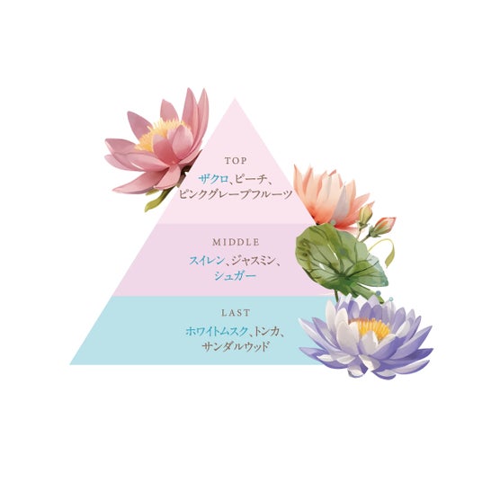 やさしいベルガモットのトップから、睡蓮とミュゲのフローラルが流れるように広がり、洗練されたムスクが全体を包み込みます。ひんやりクール処方※11により、シュッとひと吹きすると、冷たい水の流れを感じるような清涼感をお楽しみいただけます。