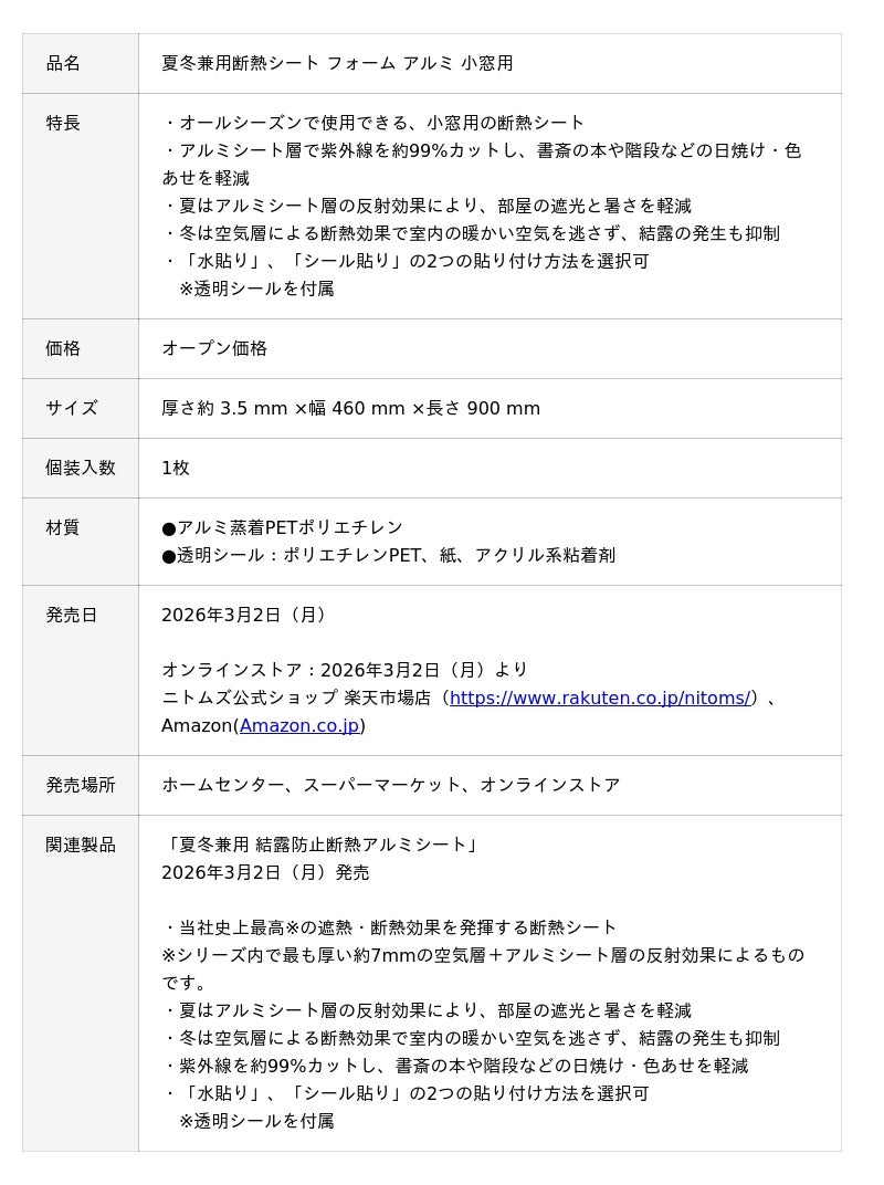 株式会社ニトムズ(本社:東京都品川区、代表取締役社長:右近敦嗣)は、トイレやキッチン、階段などの小窓に貼るだけで、遮熱・断熱効果を発揮する「夏冬兼用断熱シート フォーム アルミ 小窓用」を2026年3月2日(月)に発売します。