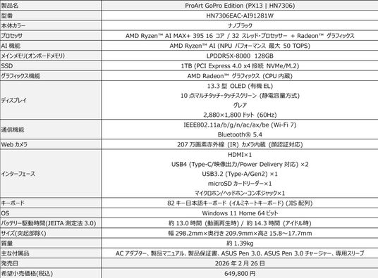 さらに2026年1月23日(金)実施のプレスリリース実施の「GoPro」とコラボレーション製品「ProArt GoPro Edition (PX13 | HN7306EAC)」を2月26日(木)より発売開始します。