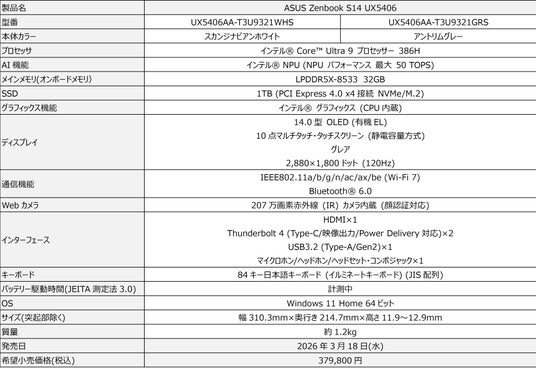 ASUS JAPAN株式会社は、最新のインテル(R) Core(TM) Ultra X9 プロセッサー 388Hと2つの14型有機ELディスプレイを搭載し、デュアルスクリーンモードやデスクトップモードなど、様々なモードで使用できる、革新的なデュアルディスプレイノートPCの「ASUS Zenbook DUO UX8407AA」と、インテル(R) Core(TM) Ultra 9 プロセッサー 386Hを搭載した薄型軽量スタイリッシュな14型ノートPC「ASUS Zenbook S14 UX5406AA」の2製品計3モデルも発表いたしました。「ASUS Zenbook DUO UX407AA」は3月下旬以降発売を予定し、「ASUS Zenbook S14 UX5406AA」は2月26日(木)より予約開始し、3月18日(水)発売予定となります。