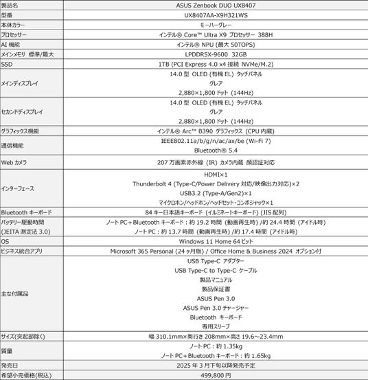 ※今回発表のASUS Zenbook DUO UX8407AAの詳細スペックはこちらからご確認ください。