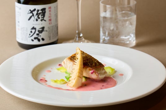 獺祭とのペアリングが楽しめる期間限定コース。その中のスペシャルな一皿は、獺祭の酒粕を使ったシェフオリジナルソースが決め手の魚料理(白身魚のグリルとオマール海老(ハーフ)または蝦夷アワビ)。酒粕の甘みのある風味に塩気と美しい色味をプラスするしば漬けがいいアクセントに。獺祭との相性も抜群です。