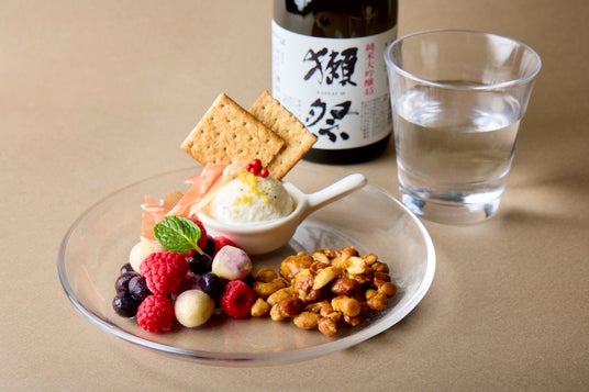 獺祭「純米大吟醸 45」と一緒に楽しむ、大人のための小さなご褒美プレート。ヨーグルトアイス×生ハム、フルーツモッツァレラの爽やかさ、塩キャラメルナッツの香ばしさを少しずつ楽しめる贅沢なプレートです。