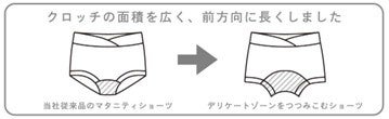 ●クロッチの長さに関する不満に応えるため、広く、前方向へ長いクロッチ設計を採用。クロッチ部分を前身頃側へ長めに配置することで、妊娠中に増えやすいおりものもしっかりとカバーします。