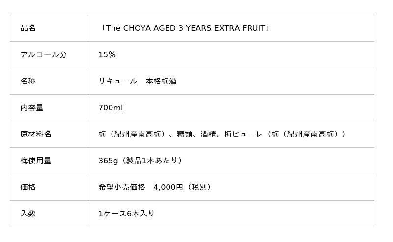 チョーヤ梅酒株式会社(本社:大阪府羽曳野市、社長:金銅重弘、以下チョーヤ)は、2019年7月から海外・免税店限定で販売しておりました本格梅酒「The CHOYA AGED 3 YEARS EXTRA FRUIT(ザ・チョーヤ エイジド・スリーイヤーズ エクストラ・フルーツ)」を2026年3月10日(火)から全国と公式オンライン「蝶矢庵」で発売いたします。