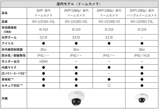 そのほか、屋内モデル全機種に内蔵マイクを標準装備し音声記録にも対応、高解像度5MP機種、赤外線(IR-LED)照射搭載機種、HDMI(※3)映像出力機能搭載機種も揃えました。