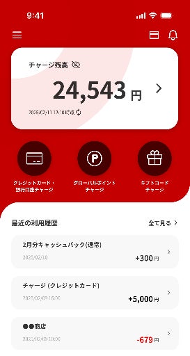 グローバルポイントを「グローバルポイント Wallet」に1ポイント=5円換算でチャージ。 Apple Pay または Google Pay(TM) に設定して、Visaのタッチ決済が利用可能。毎月10日に利用金額の0.5%をアプリ残高に自動でキャッシュバック。