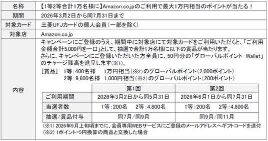 三菱UFJニコスは3月2日から7月31日まで、「三菱UFJカード」の個人会員向けに、Amazon.co.jpでの利用金額合計5,000円を1口として400名様に1万円相当※(2,000ポイント)、9,600名様に1,000円相当(200ポイント)が当たる、合計“1万名”様の抽選キャンペーンを実施します。※1ポイント=5円換算の商品と交換した場合
