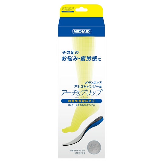 こうしたニーズにお応えするため、好評の特徴はそのままに、帯電を抑制する機能を付加した「メディエイド アシストインソール アーチ&グリップ 静電気帯電防止」を新たに発売いたします。