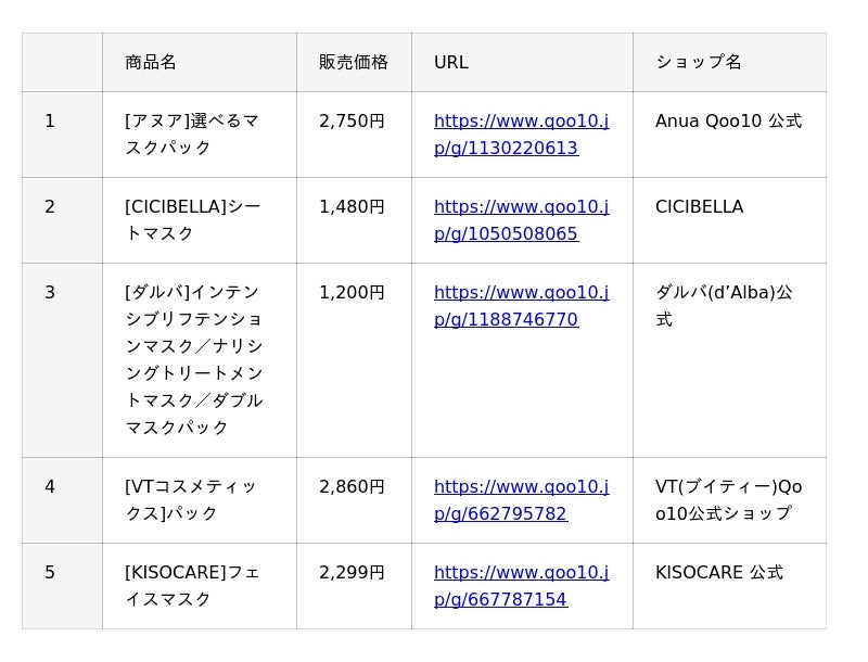 Qoo10(https://www.qoo10.jp/)サイト上、「フェイスパック」「リップメイク」「アイシャドウ」「チーク」カテゴリーの公式ショップ各販売個数に基づいたランキングです。