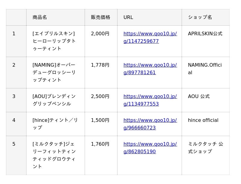 インターネット総合ショッピングモール「Qoo10」を運営するeBay Japan合同会社(本社:東京都港区、代表取締役:グ ジャヒョン)は、Qoo10で人気のコスメカテゴリーの中から、『リップ』『アイシャドウ』『チーク』と、月替わりで1アイテムをピックアップした、月間販売数TOP5※をご紹介していきます。